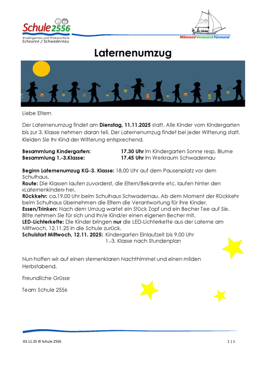 Dienstag, 11.11.2025 Laternenumzug (Kindergarten bis 3. Klasse)